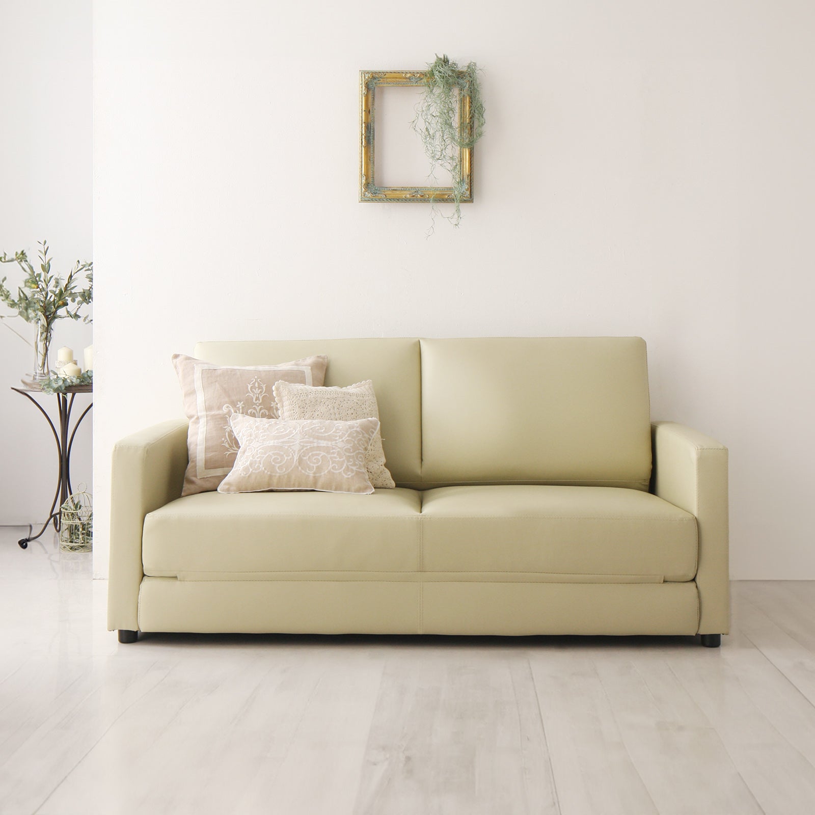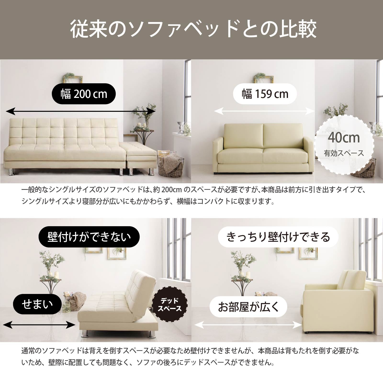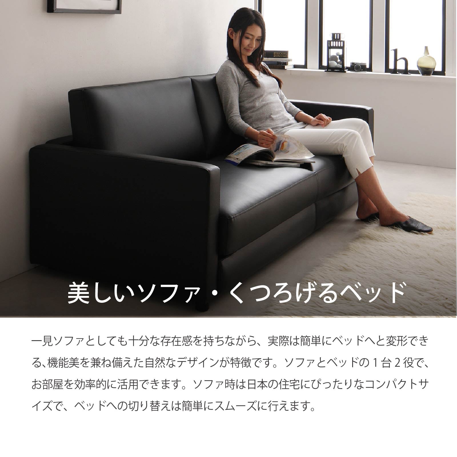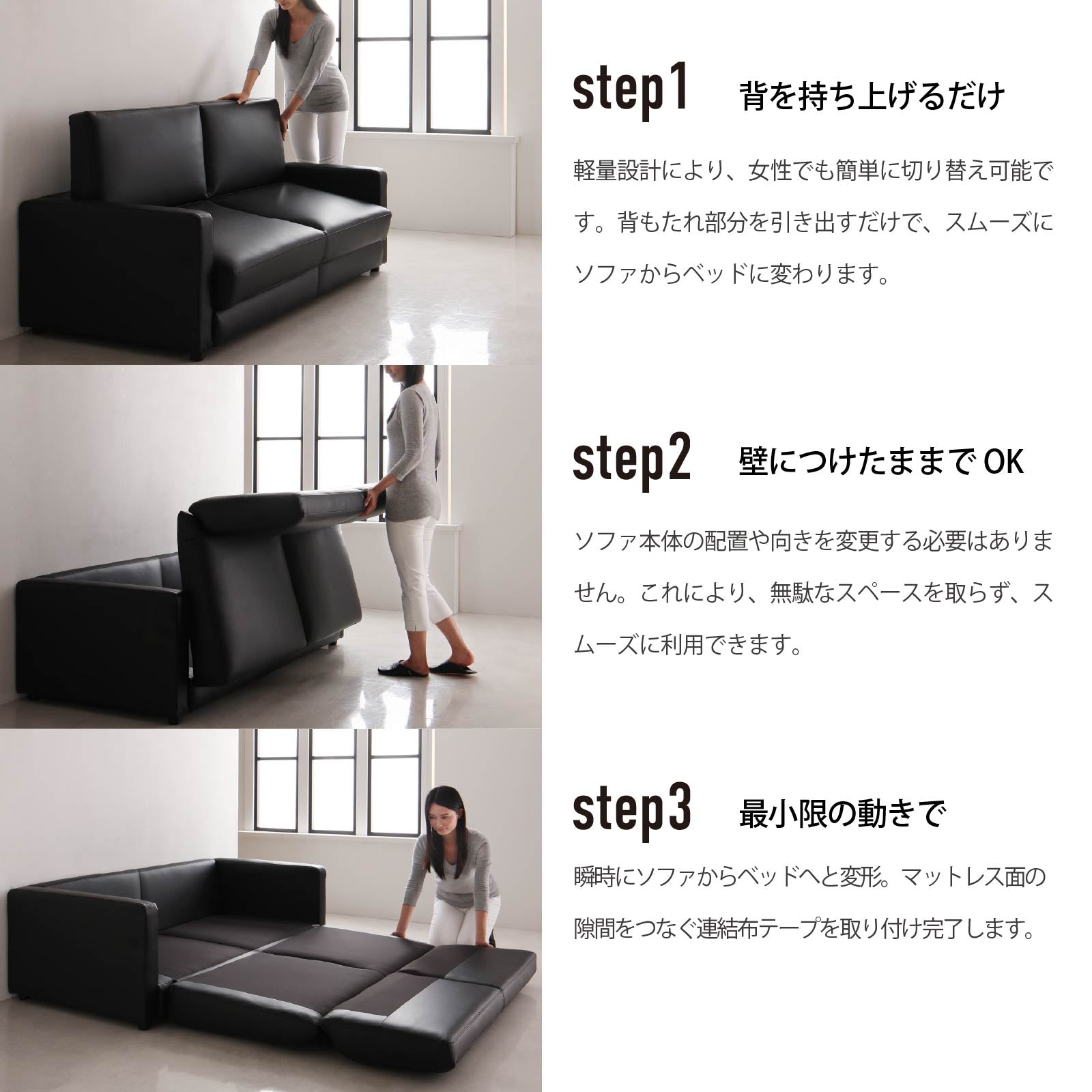 ソファとベッドの1台2役設計。ソファ時はコンパクトなサイズで、日本の住宅に最適。ベッドとして使用する際は、背もたれを引き出すだけで簡単に切り替え可能。軽量設計のため、女性でも楽に操作が可能。連結布テープを取り付けるだけで完成。