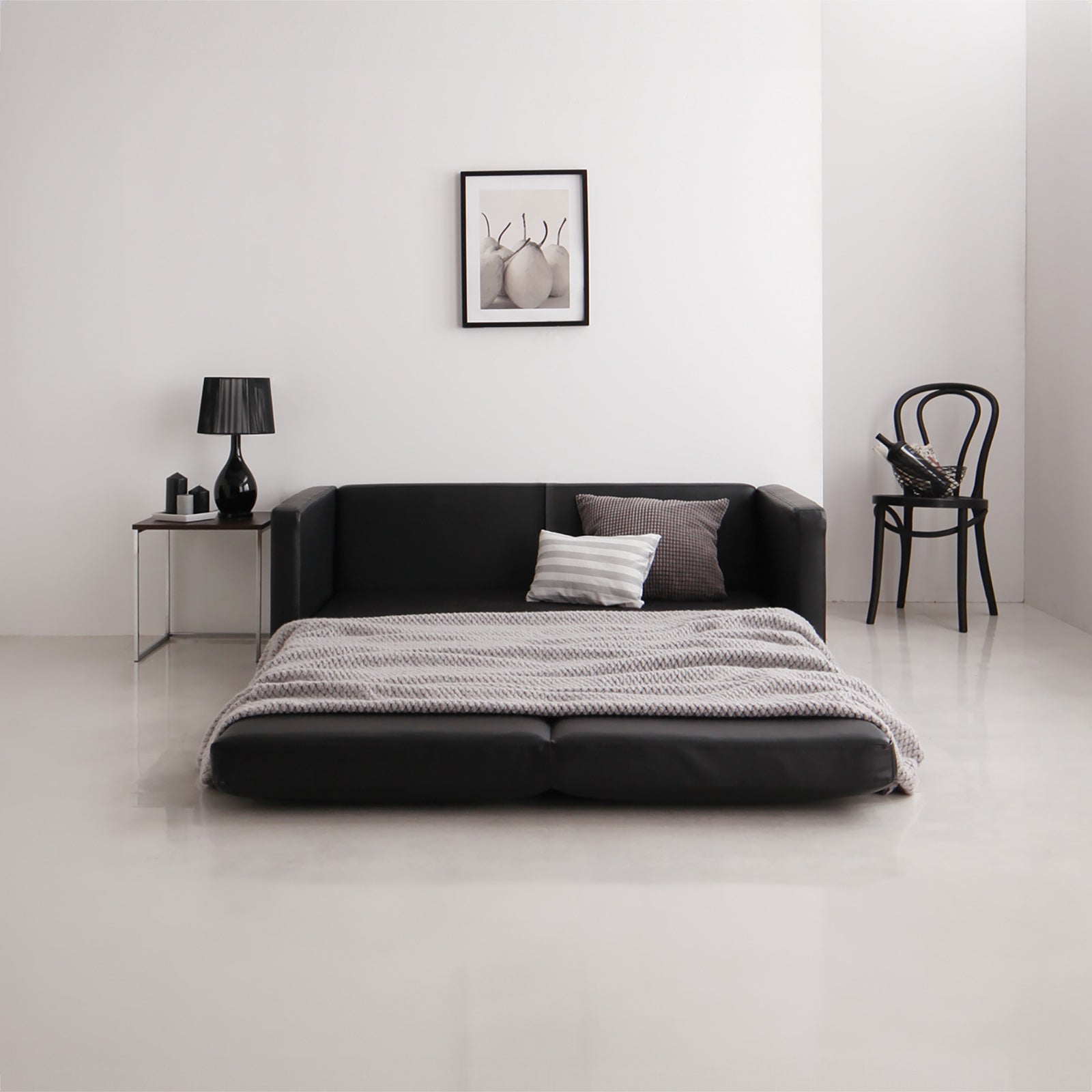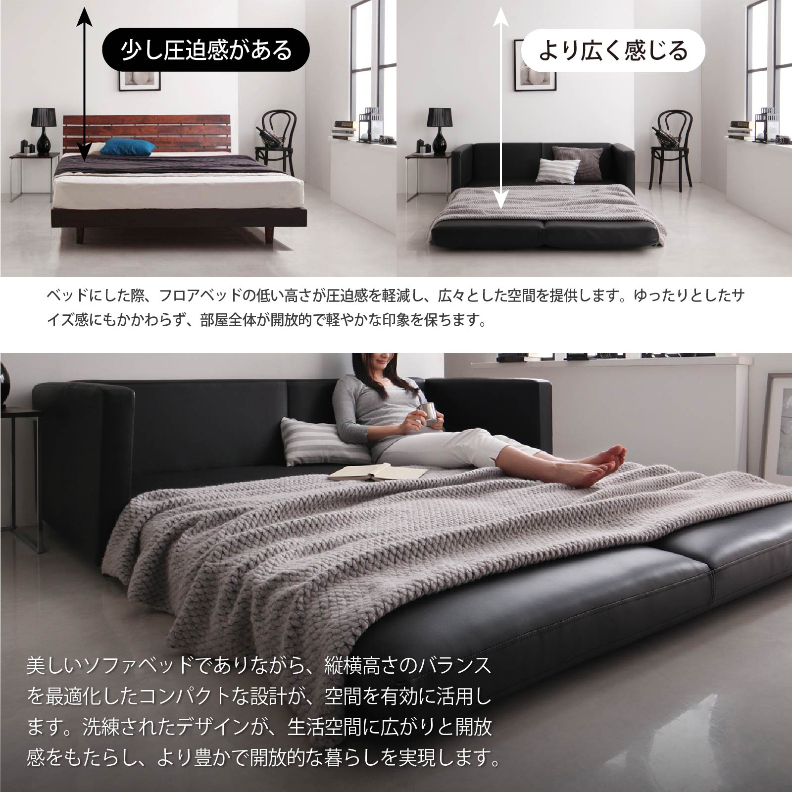 横幅を取らない省スペース設計で、壁際にも配置可能。デッドスペースを作らず、部屋を広く使える。ベッドにした際も高さが抑えられたフロアベッドになり、圧迫感なく開放感を維持。